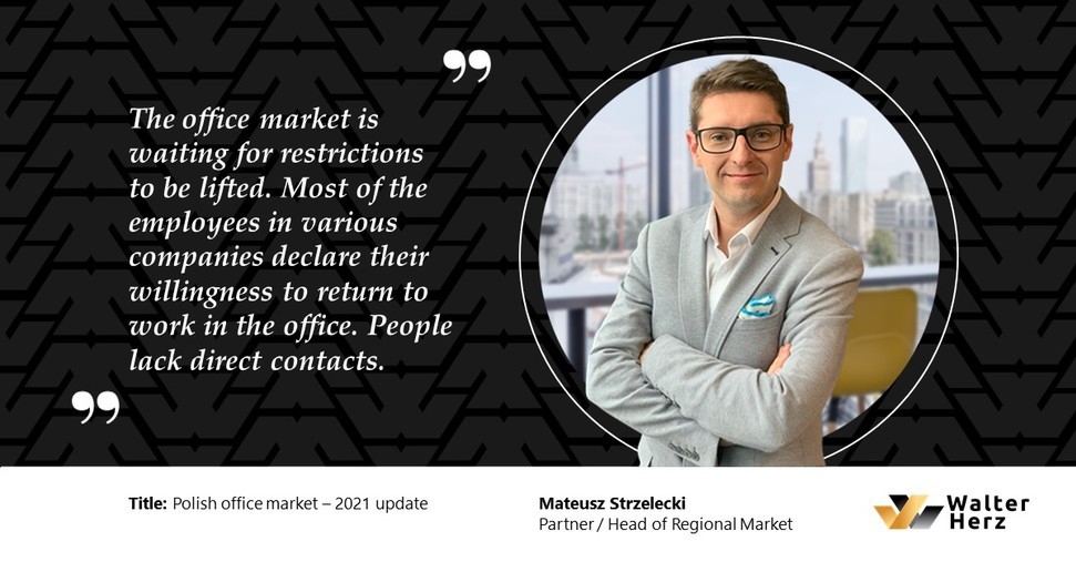 The office market is waiting for restrictions to be lifted. Most of the employees in various companies declare their willingness to return to work in the office. People lack direct contacts. If the restrictions hampering the normal functioning of the business are lifted, the pace of return to offices will certainly increase. After more than a year of the pandemic, we are sure that stationary offices will remain the foundation of operations for the organization, because building interpersonal relationships is the core of effective cooperation. However, these will be other offices adapted to the new reality.