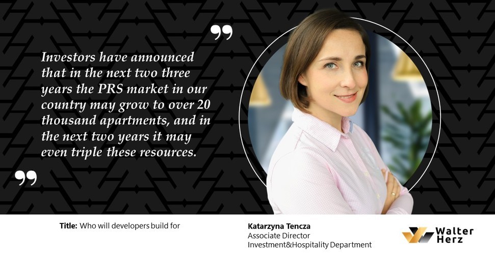 - Investors have announced that in the next two three years the PRS market in our country may grow to over 20 thousand apartments, and in the next two years it may even triple these resources. This year, we can already expect several large transactions, including forward funding contracts, under which funds participate in financing the construction of projects. European funds as well as Israeli and American capital are interested in entering the polish market. The largest companies active on our market include, among others, TAG Immobilien, Resi4Rent, Heimstaden Bostad, Golub GetHouse, Catella, Aurec Capital Poland, Van der Vorm Vastgoed, and Zeitgeist Asset Management - says Katarzyna Tencza, Associate Director Investment & Hospitality at Walter Herz.