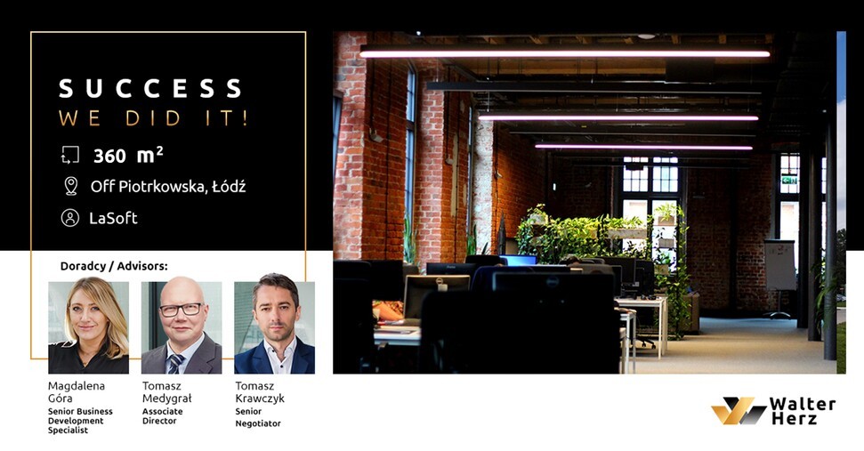 – Doceniamy zaufanie, jakim w kluczowym momencie dla swojej działalności obdarzyła nas firma LaSoft. W trakcie procesu najmu, który obejmował całościowe doradztwo dogłębnie poznaliśmy specyfikę pracy i potrzeby firmy. Pozwoliło to na wybór najbardziej optymalnej lokalizacji dla zespołu, który pracuje w Polsce i zapewnienie mu komfortowego i atrakcyjnego środowiska pracy. Chcielibyśmy także podziękować za możliwość uczestniczenia w uroczystej inauguracji pracy nowego oddziału firmy, w której udział brali m.in. również przedstawiciele Urzędu Miasta Łodzi z departamentu odpowiedzialnego za rozwój relacji inwestorskich w aglomeracji – mówi Tomasz Medygrał, Associate Director w Walter Herz.