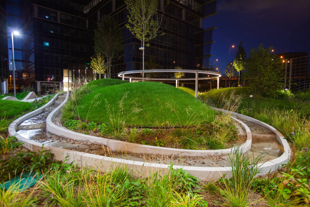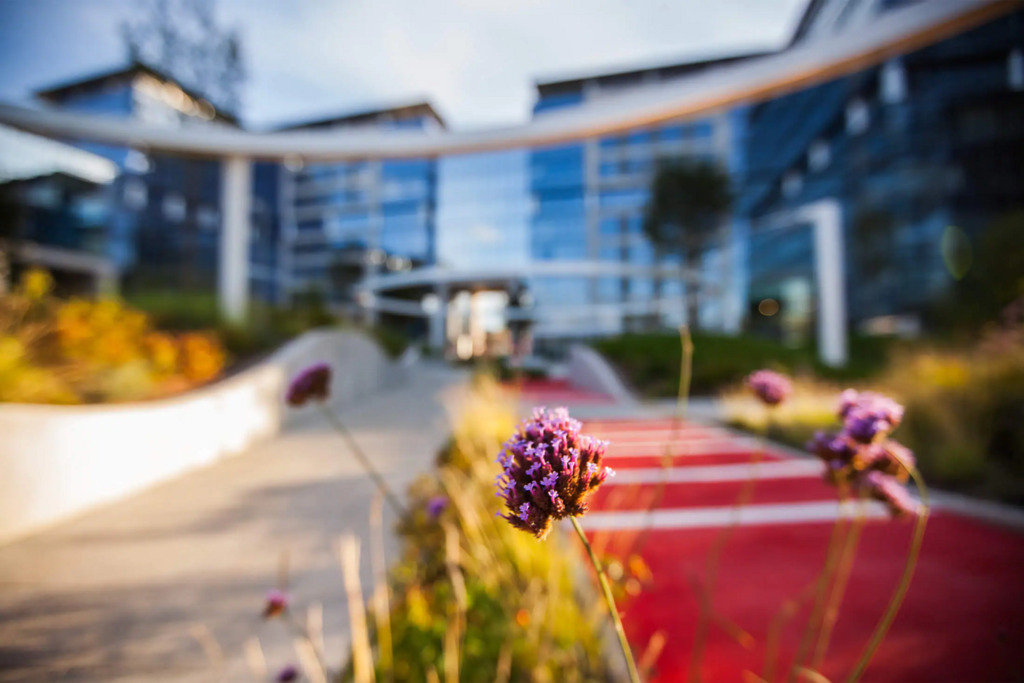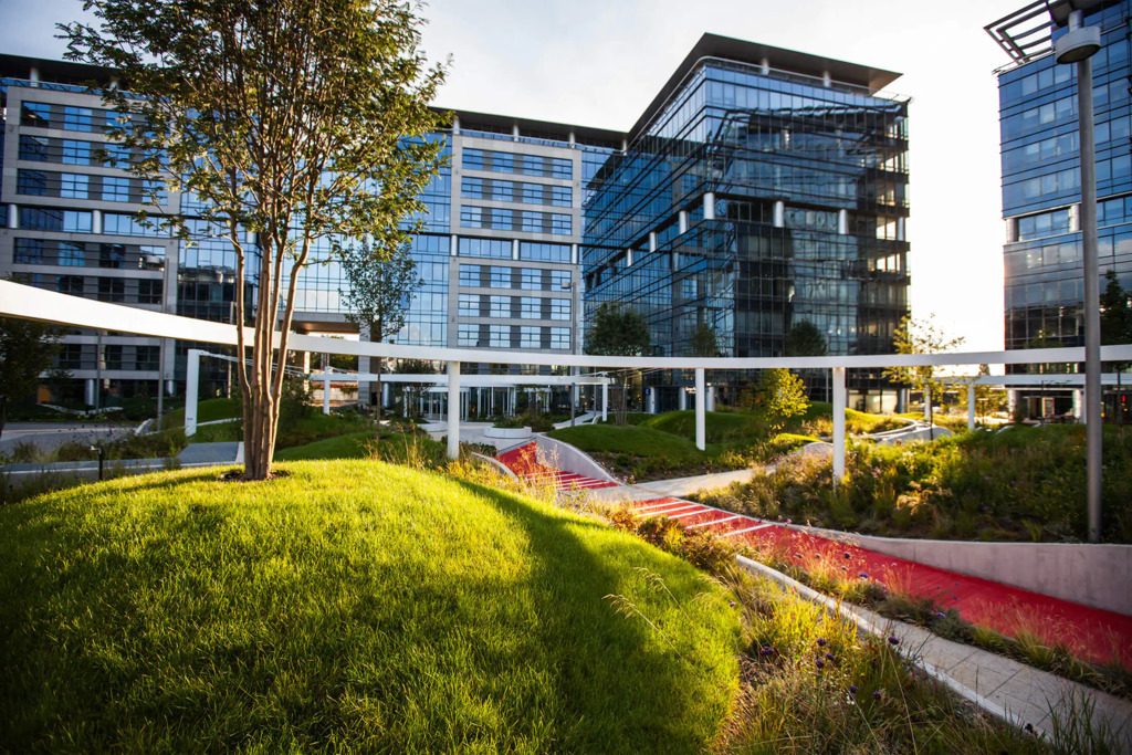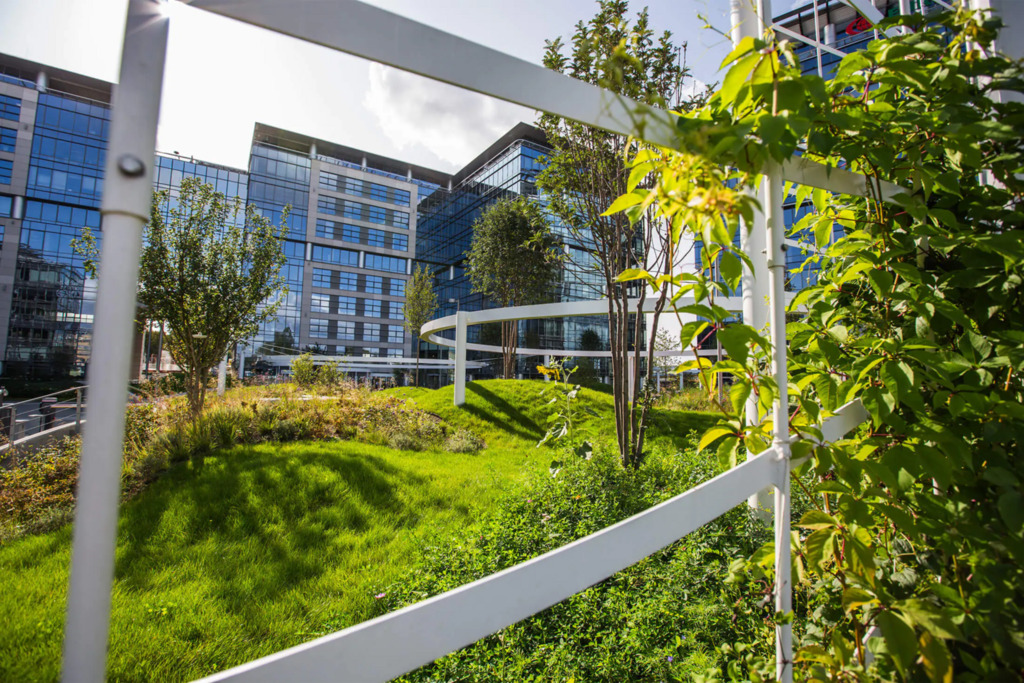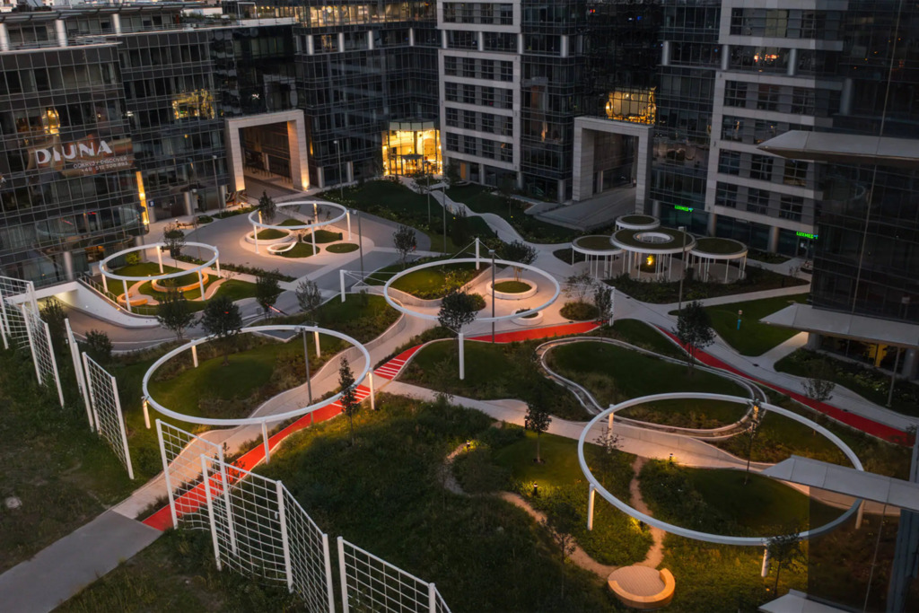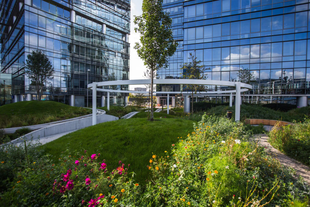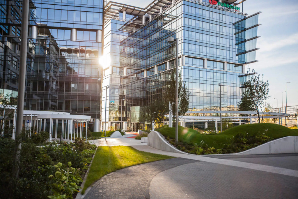 Po modernizacji dziedziniec i część zewnętrzna kompleksu zostały przekształcone z betonowego parkingu w ogólnodostępny park z zielenią – drzewami, krzewami i strumykiem, tworząc przyjazne środowisko pracy i możliwość organizowania spotkań na świeżym powietrzu.