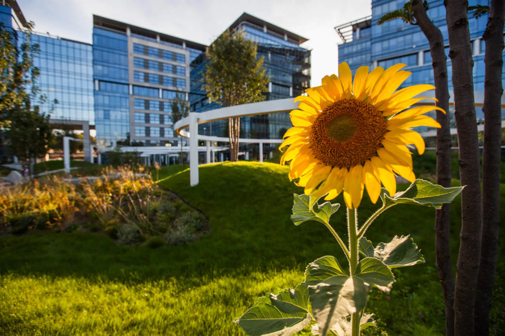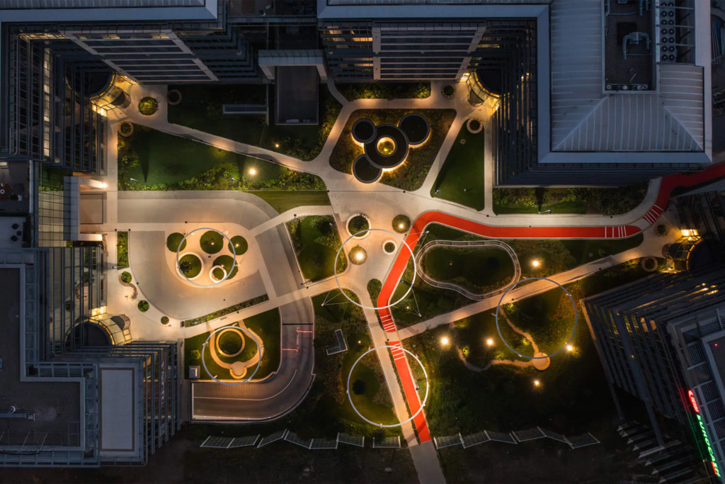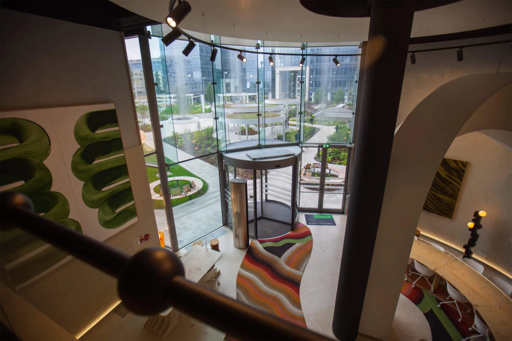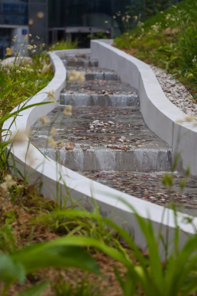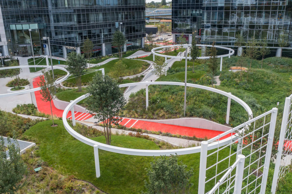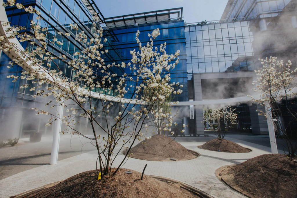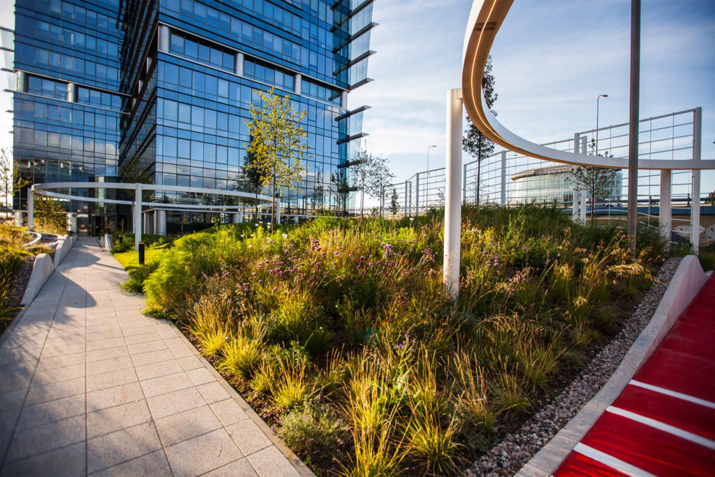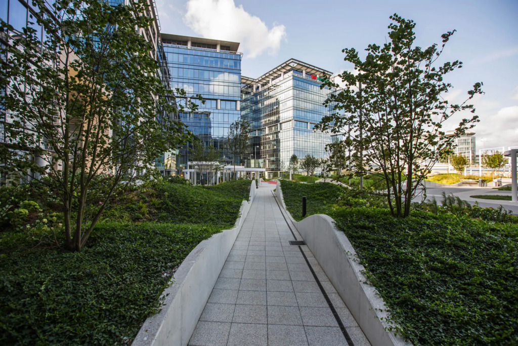 Po modernizacji dziedziniec i część zewnętrzna kompleksu zostały przekształcone z betonowego parkingu w ogólnodostępny park z zielenią – drzewami, krzewami i strumykiem, tworząc przyjazne środowisko pracy i możliwość organizowania spotkań na świeżym powietrzu.